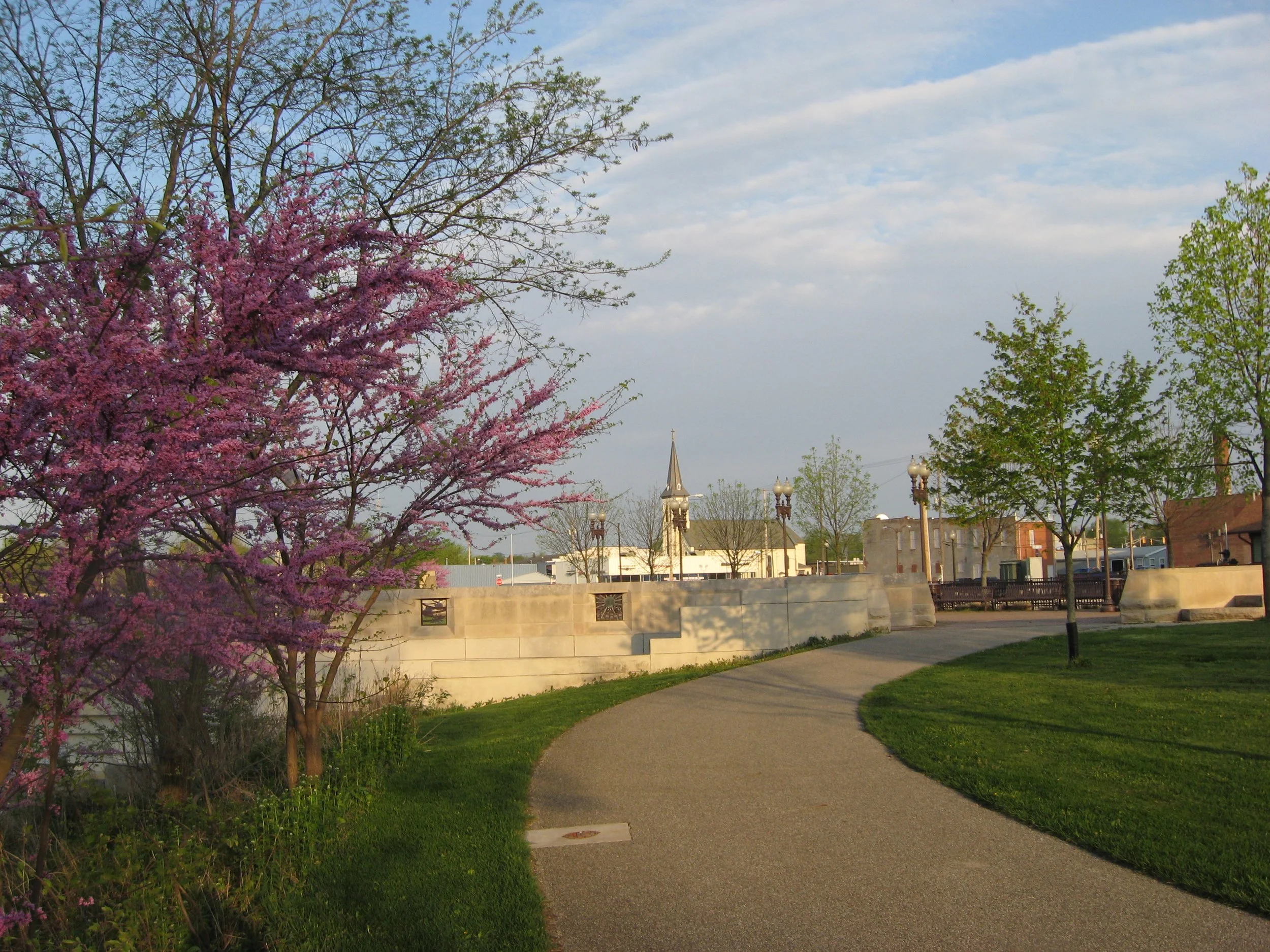 This 5-acre park provides the community with a 1.8-mile trail, winding along the Wabash River with beautiful views of the water and the wildlife that lives within it. Trail amenities include commercial benches, authentic benches made of limestone, historical information, 3 different murals, pillars with a seat wall, and an Indiana Department of Natural Resources Public Access Site for watercraft to enter the river. The trail and the drinking fountains are fully accessible.